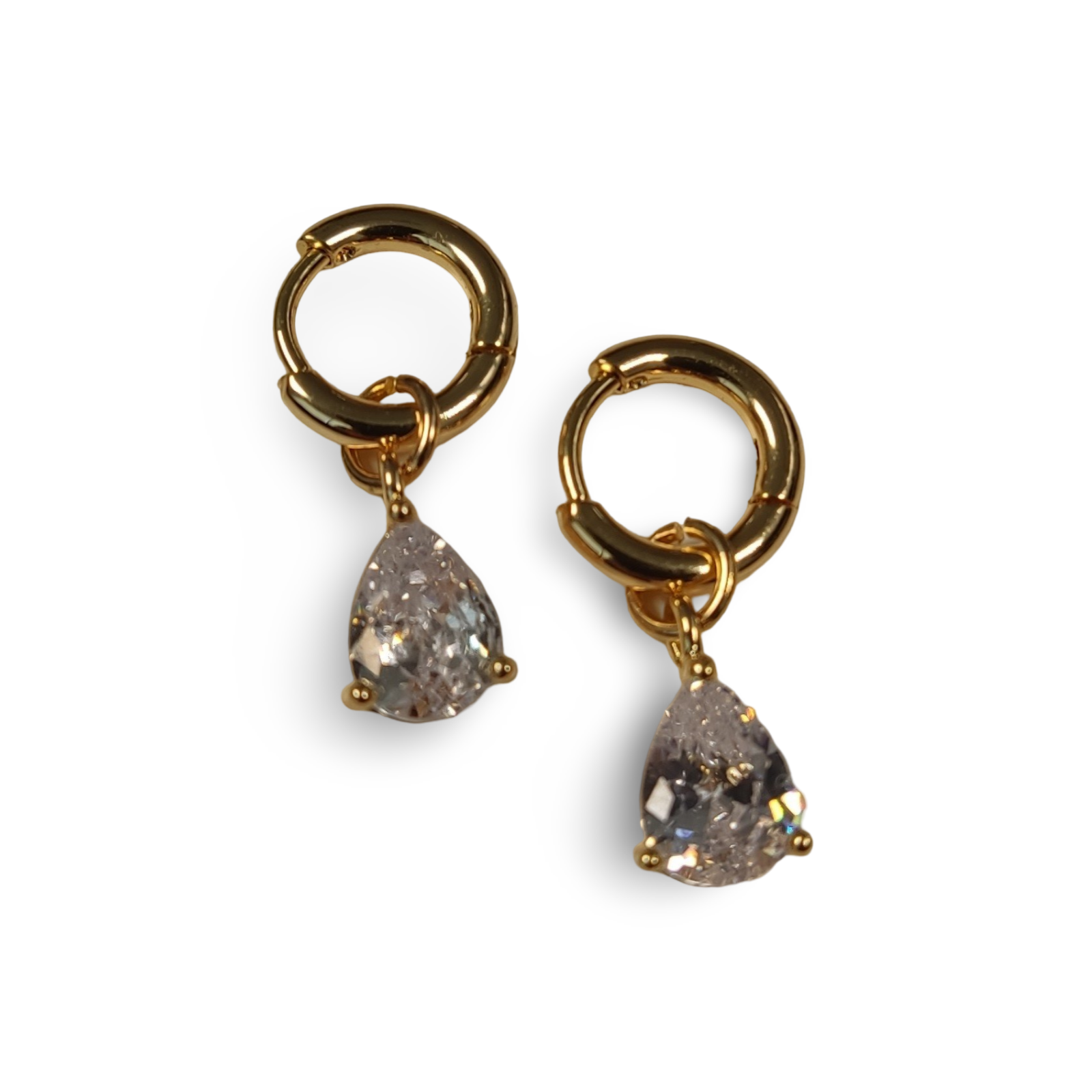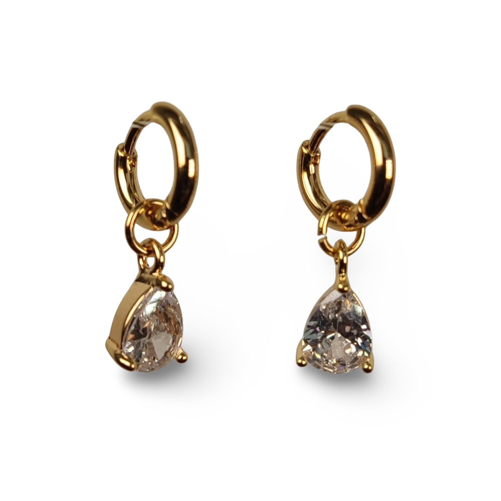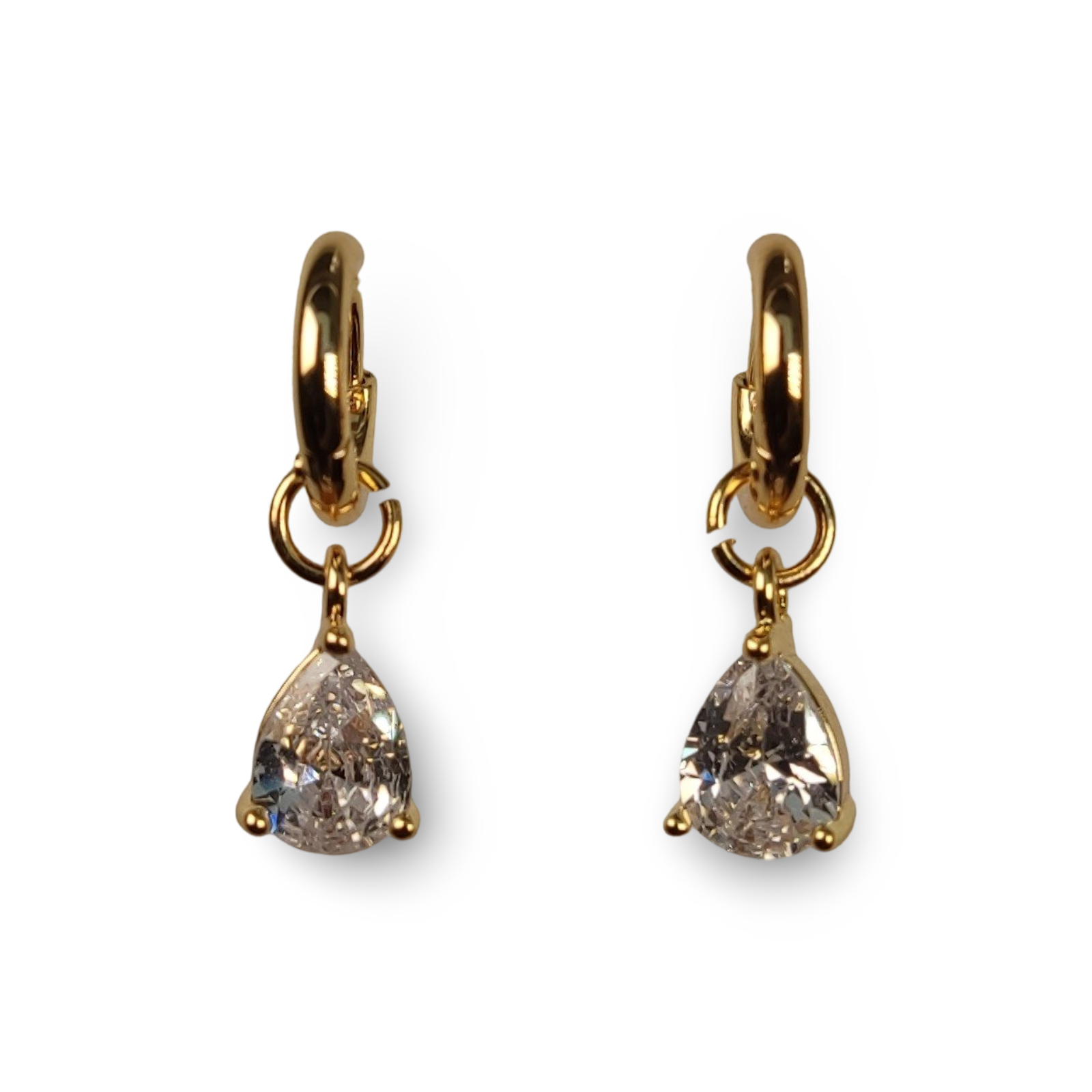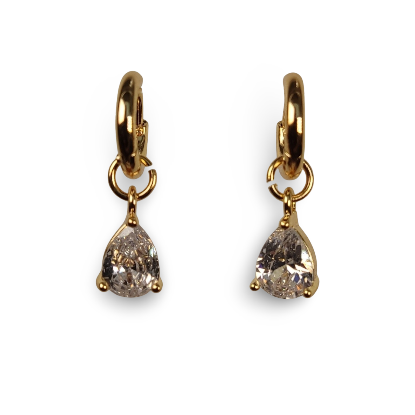Material: Mini Hoops de chapa de oro de 18k, Charm de Circonia verde o blanca en forma de gota.
